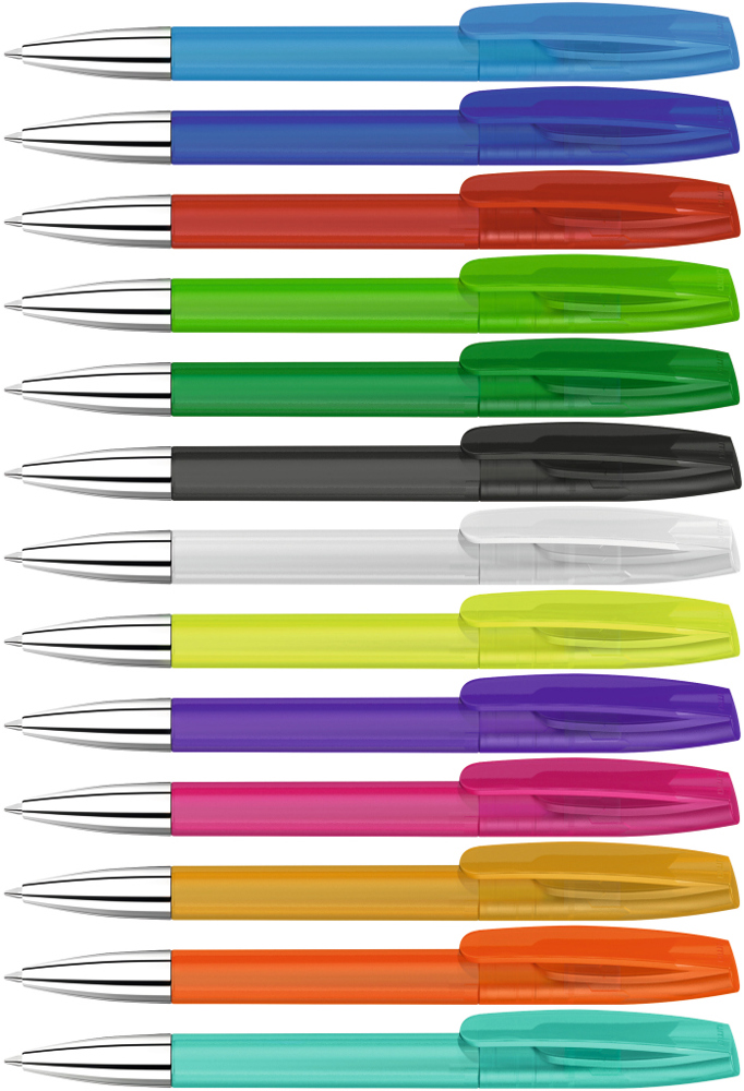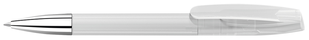 Drehkugelschreiber mit transparent gefrostetem Gehäuse und silberner Spitze glanzverchromt. mehr
