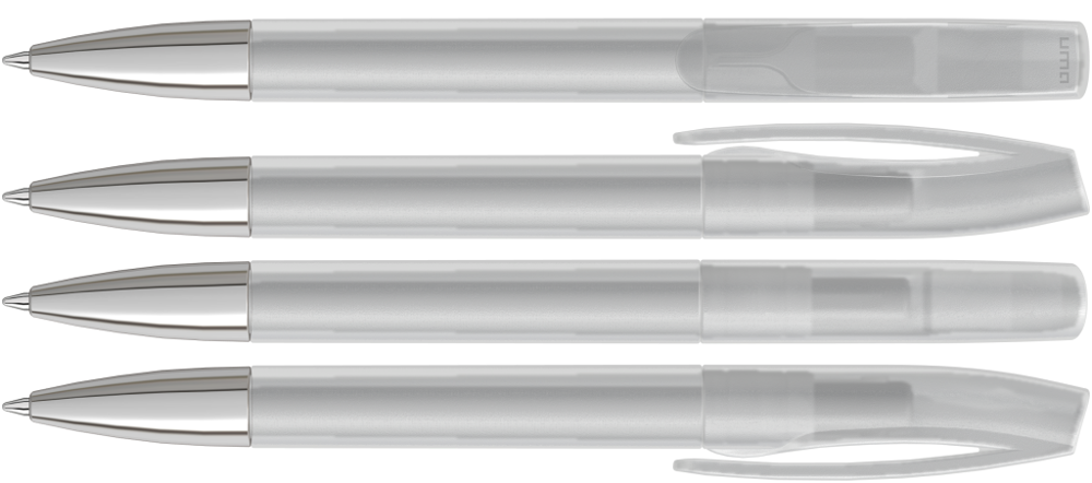 Drehkugelschreiber mit transparent gefrostetem Gehäuse und silberner Spitze glanzverchromt.