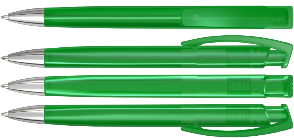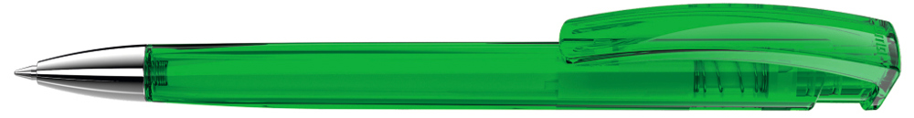 Druckkugelschreiber mit transparent glänzendem Dreikantgehäuse und schwerer Metallspitze glanzverchromt.