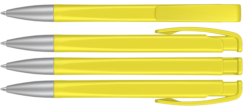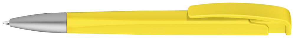 Druckkugelschreiber mit geometrisch wechselnder Schaftform, matt gedecktem Gehäuse und Metallspitze matt verchromt.