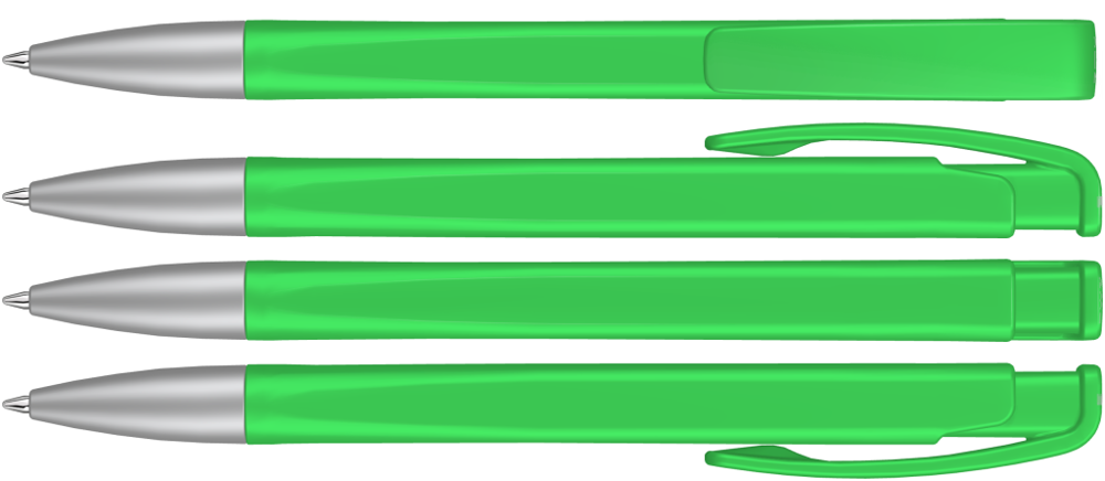 Druckkugelschreiber mit geometrisch wechselnder Schaftform, matt gedecktem Gehäuse und Metallspitze matt verchromt.
