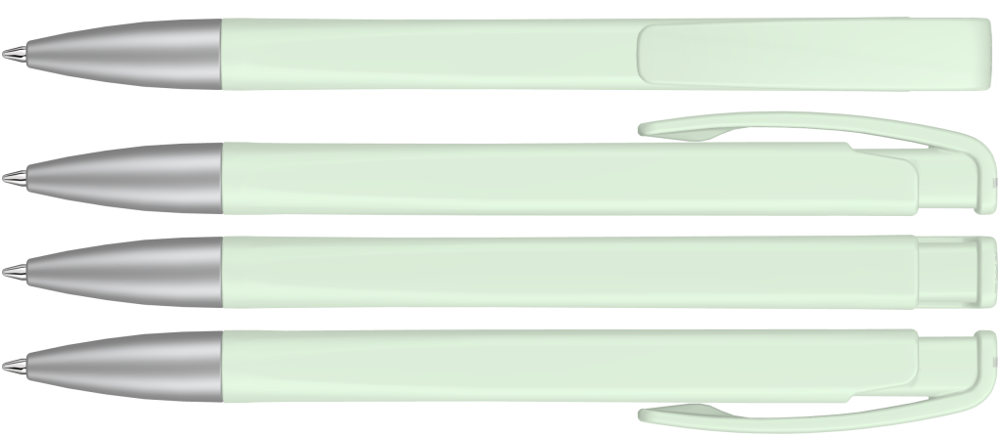 Druckkugelschreiber mit geometrisch wechselnder Schaftform, matt gedecktem Gehäuse und Metallspitze matt verchromt.