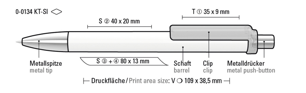 Druckkugelschreiber mit gedeckt glänzendem Schaft, transparent glänzendem Clip, Metallspitze und Metalldrücker glanzverchromt.