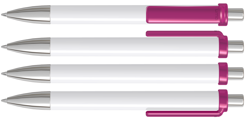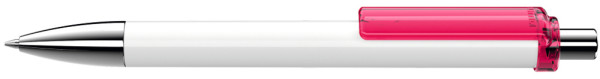 Druckkugelschreiber mit gedeckt glänzendem Schaft, transparent glänzendem Clip, Metallspitze und Metalldrücker glanzverchromt.