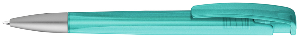 Druckkugelschreiber mit geometrisch wechselnder Schaftform, transparent gefrostetem Gehäuse und Metallspitze matt verchromt.