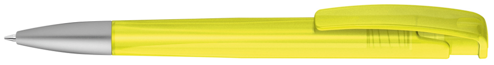 Druckkugelschreiber mit geometrisch wechselnder Schaftform, transparent gefrostetem Gehäuse und Metallspitze matt verchromt.