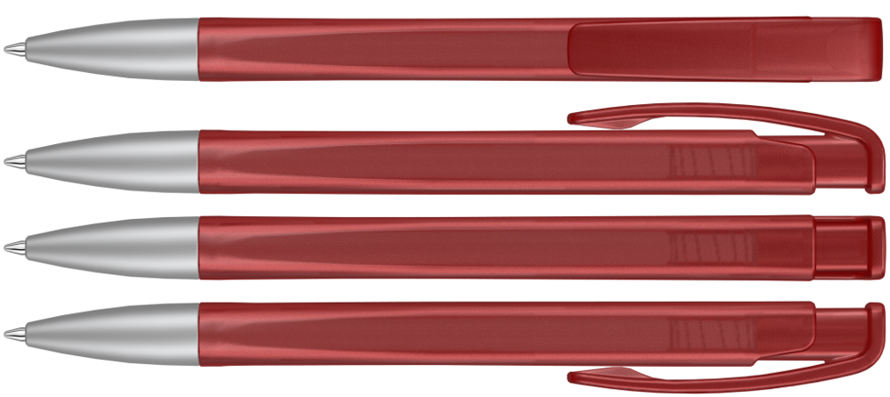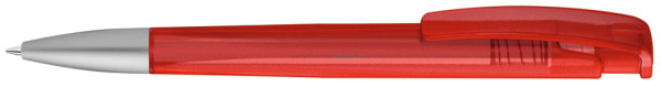 Druckkugelschreiber mit geometrisch wechselnder Schaftform, transparent gefrostetem Gehäuse und Metallspitze matt verchromt.