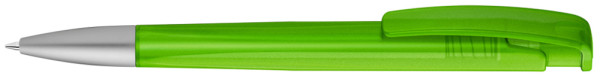 Druckkugelschreiber mit geometrisch wechselnder Schaftform, transparent gefrostetem Gehäuse und Metallspitze matt verchromt.