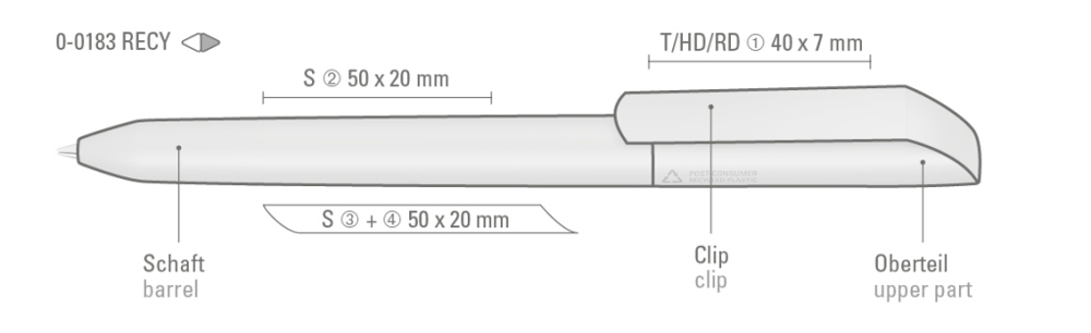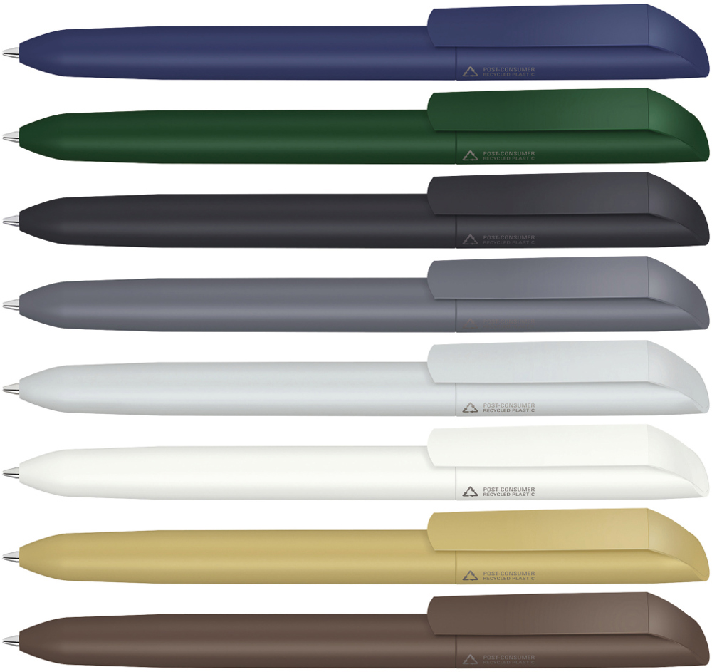 Drehkugelschreiber mit gedeckt mattem Gehäuse und Clip aus 100% recyceltem Post-Consumer-Kunststoff.