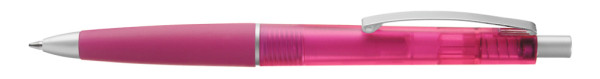 Druckkugelschreiber mit transparent gefrostetem Gehäuse, Gummigriffzone und geschwungenem Metallclip. Drücker, Zierring und Spitze in matt silber.