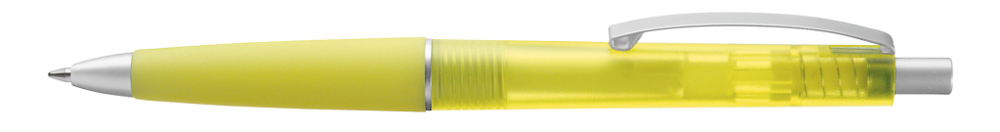 Druckkugelschreiber mit transparent gefrostetem Gehäuse, Gummigriffzone und geschwungenem Metallclip. Drücker, Zierring und Spitze in matt silber.