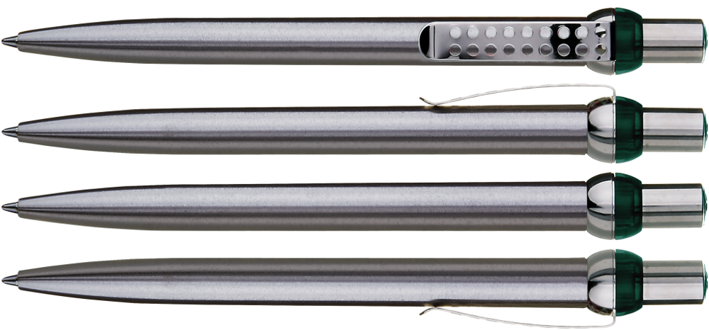 Metall-Druckkugelschreiber mit verchromtem und lackiertem Schaft. Obere Halbkugel und Stopfen farbig transparent. Gelochter Metallclip, Drücker und untere Halbkugel verchromt.