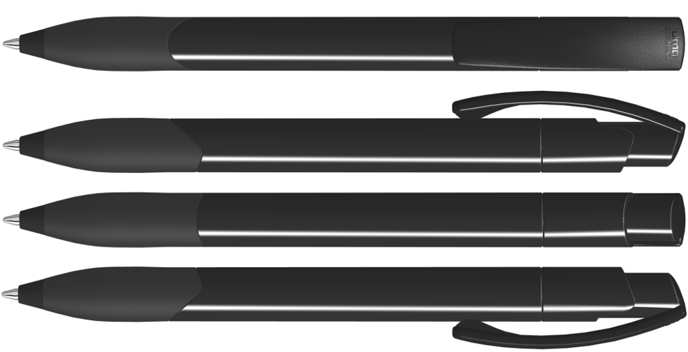 Druckkugelschreiber mit gedeckt glänzendem Schaft und Clipdrücker in weiß. Gummigriffzone und Manschette farbig.