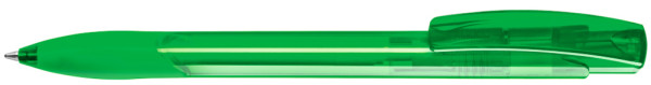 Druckkugelschreiber mit transparent glänzendem Schaft, Gummigriffzone und Clipdrücker.