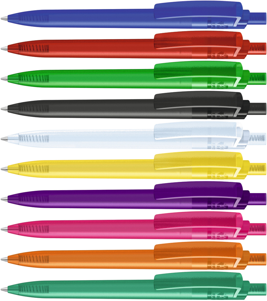 Druckkugelschreiber aus recyceltem PET-Material mit transparent gefrostetem Gehäuse, Clip und Drücker.
