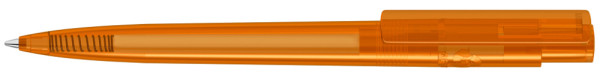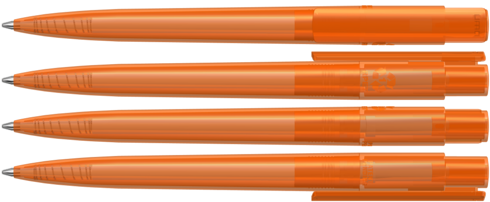 Druckkugelschreiber aus recyceltem PET-Material mit transparent glänzendem Gehäuse und Clip.