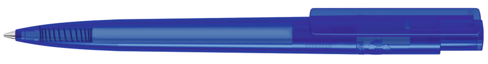 Druckkugelschreiber aus recyceltem PET-Material mit transparent glänzendem Gehäuse und Clip.
