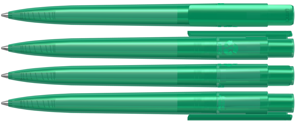 Druckkugelschreiber aus recyceltem PET-Material mit transparent glänzendem Gehäuse und Clip.