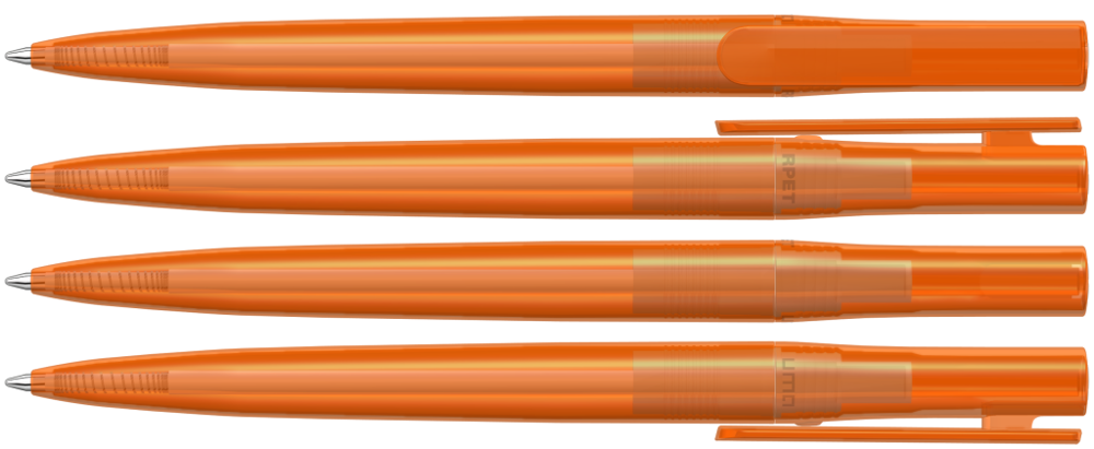 Drehkugelschreiber aus recyceltem PET-Material mit transparent glänzendem Gehäuse.