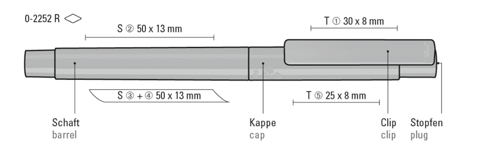 Rollerball mit Gehäuse aus recyceltem PET-Material in gedeckt glänzend weiß oder schwarz. Stopfen in den 8 möglichen Schreibfarben.