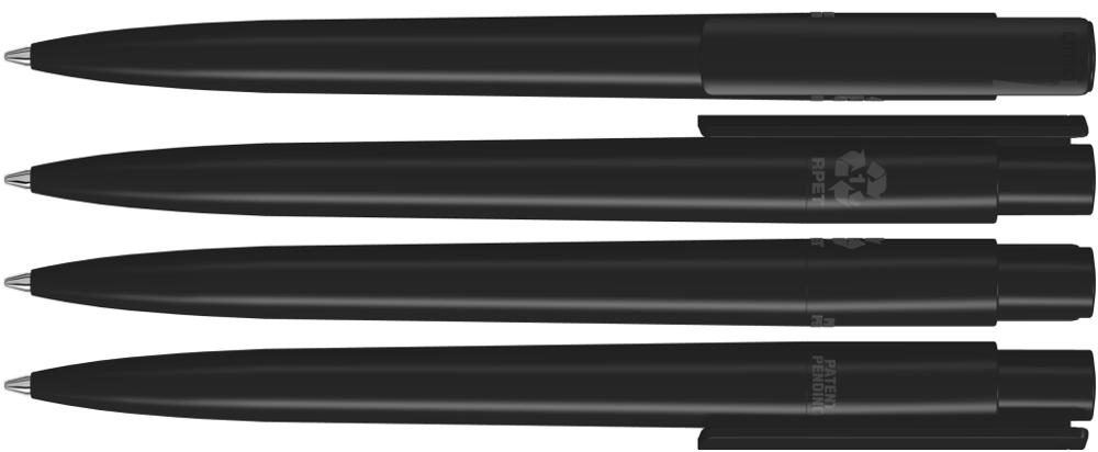 Druckkugelschreiber aus recyceltem PET-Material mit gedeckt glänzendem Gehäuse und Clip.