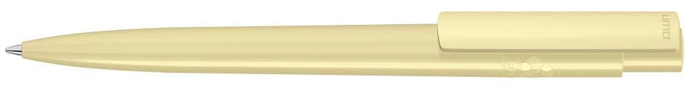 Druckkugelschreiber aus recyceltem PET-Material mit gedeckt glänzendem Gehäuse und Clip.