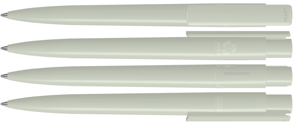 Druckkugelschreiber aus recyceltem, antibakteriellem und antiviralem rPET in gedeckt glänzendem Gehäuse und Clip. Der nach ISO 22196 und ISO 21702 geprüfte antimikrobielle Zusatz verleiht dem rPET eine antibakterielle und antivirale Wirkung auch gegen Corona-Viren. Die Haftung und Ansiedlung von Bakterien oder Krankheitserregern auf der Oberfläche des Schreibgerätes wird um 99,99% verringert. Der in das rPET Material eingearbeitete antimikrobielle Zusatz kann nicht abgerieben oder abgegeben werden und wirkt über die gesamte Lebensdauer des Schreibgerätes. Eine dauerhafte Reduzierung von Krankheitserregern ist gegeben.