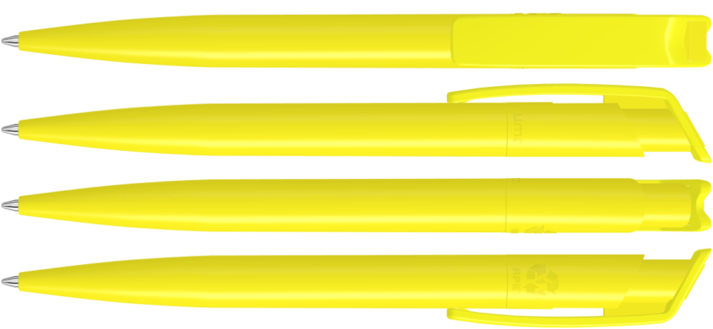 Druckkugelschreiber aus recyceltem PET-Material mit gedeckt glänzendem Gehäuse und Stopfen.