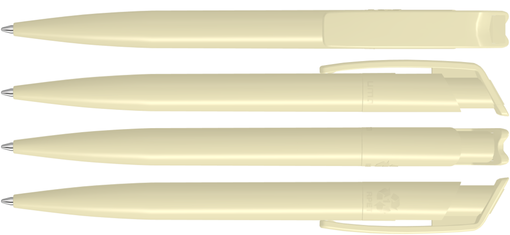 Druckkugelschreiber aus recyceltem PET-Material mit gedeckt glänzendem Gehäuse und Stopfen.