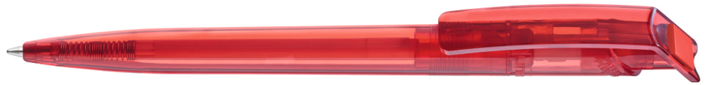 Druckkugelschreiber aus recyceltem PET-Material mit transparent glänzendem Gehäuse und gedecktem Stopfen.