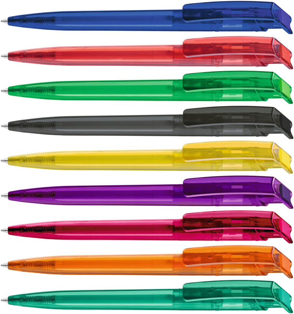 Druckkugelschreiber aus recyceltem PET-Material mit transparent glänzendem Gehäuse und gedecktem... mehr