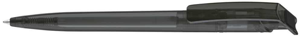 Druckkugelschreiber aus recyceltem PET-Material mit transparent glänzendem Gehäuse und gedecktem Stopfen.