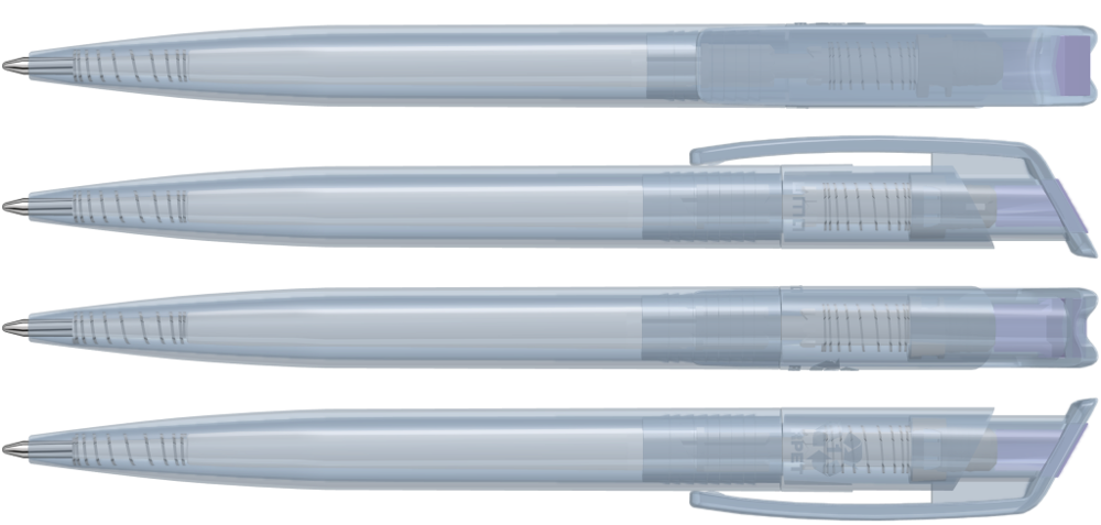 Druckkugelschreiber aus recyceltem PET-Material mit klar transparent glänzendem Gehäuse und gedecktem Stopfen.