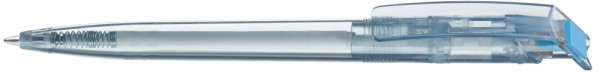 Druckkugelschreiber aus recyceltem PET-Material mit klar transparent glänzendem Gehäuse und gedecktem Stopfen.