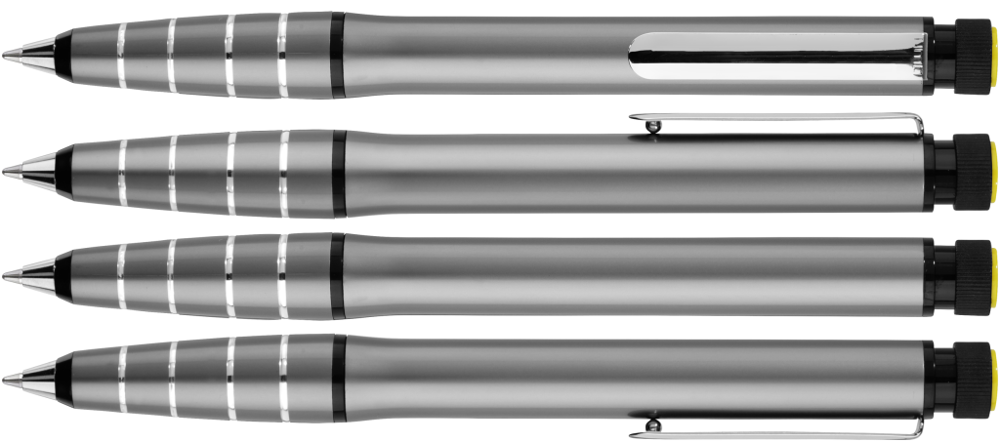 Metall-Drehkugelschreiber aus Aluminium mit integriertem gelb schreibenden Textmarker im Schaft. Der Textmarker lässt sich mittels Drehbewegung aus dem Schaft herausnehmen und kann separat genutzt werden.