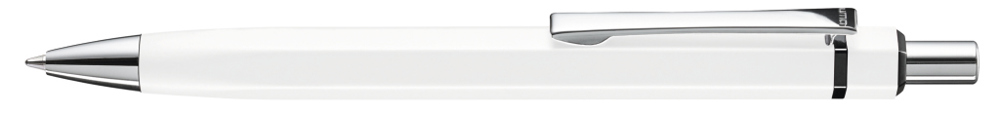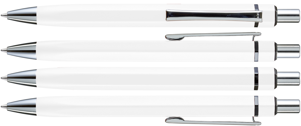 Metall-Druckkugelschreiber mit matt lackiertem, sechskantigem Aluminiumschaft. Metallclip, Metallspitze und Drücker silber glänzend. Zierring schwarz glänzend.