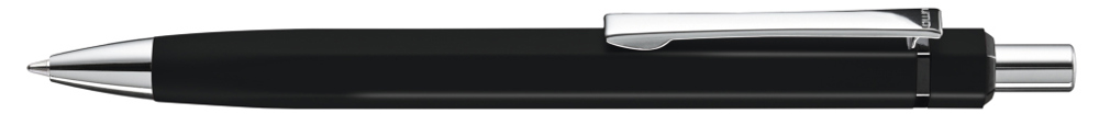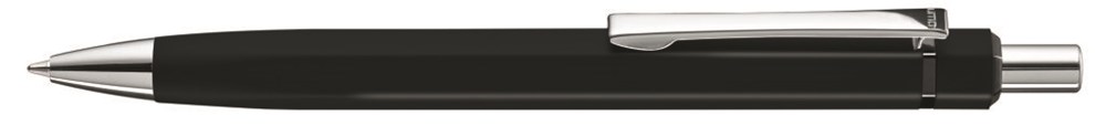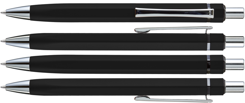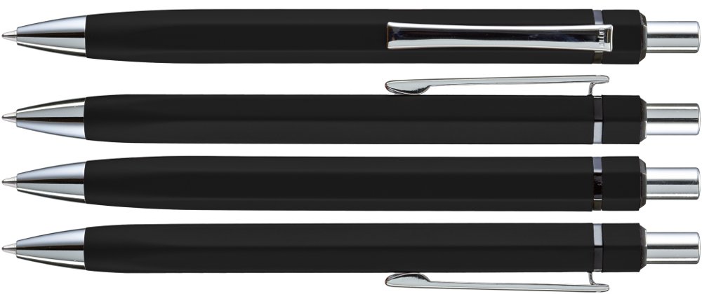 Metall-Druckkugelschreiber mit matt lackiertem, sechskantigem Aluminiumschaft. Metallclip, Metallspitze und Drücker silber glänzend. Zierring schwarz glänzend.
