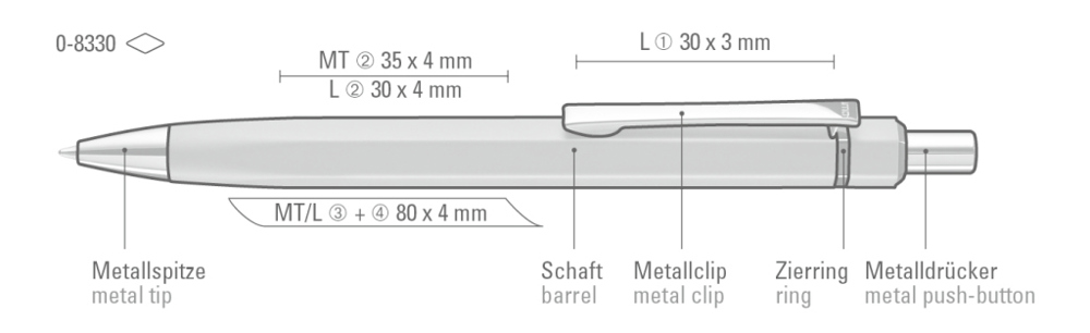 Metall-Druckkugelschreiber mit matt lackiertem, sechskantigem Aluminiumschaft. Metallclip, Metallspitze und Drücker silber glänzend. Zierring schwarz glänzend.