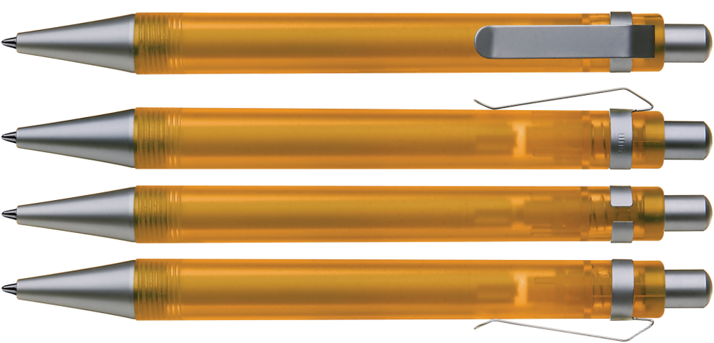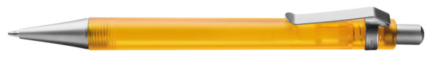 Druckkugelschreiber mit transparent gefrostetem oder gedecktem Gehäuse. Metalldrücker, Metallclip und Metallspitze matt verchromt.