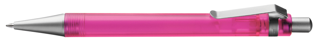 Druckkugelschreiber mit transparent gefrostetem oder gedecktem Gehäuse. Metalldrücker, Metallclip und Metallspitze matt verchromt.