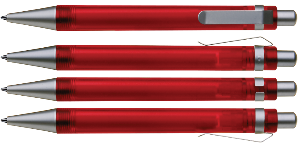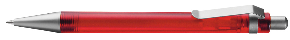 Druckkugelschreiber mit transparent gefrostetem oder gedecktem Gehäuse. Metalldrücker, Metallclip und Metallspitze matt verchromt.