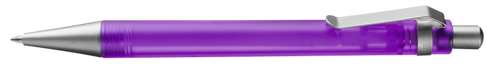 Druckkugelschreiber mit transparent gefrostetem oder gedecktem Gehäuse. Metalldrücker, Metallclip und Metallspitze matt verchromt.