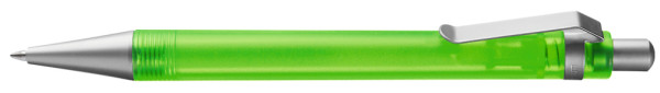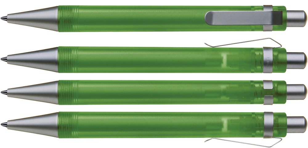 Druckkugelschreiber mit transparent gefrostetem oder gedecktem Gehäuse. Metalldrücker, Metallclip und Metallspitze matt verchromt.