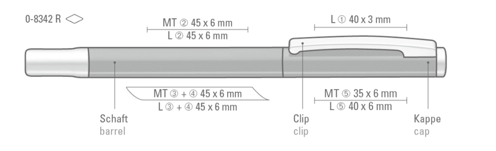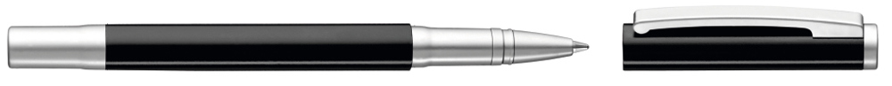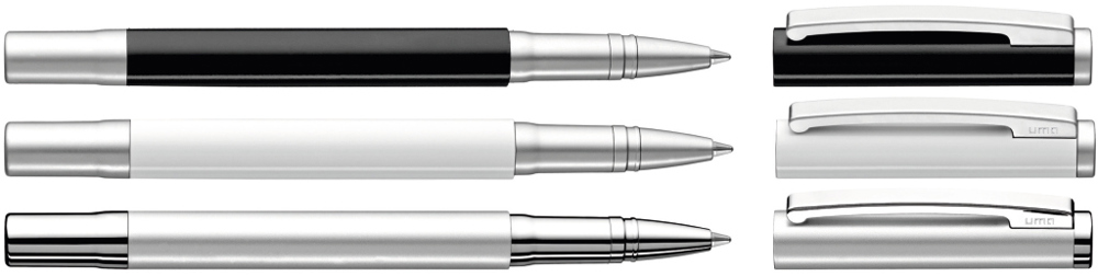 Metall-Rollerball mit gefedertem Clip. Oberfläche in silber matt mit glänzenden Beschlagteilen oder schwarz bzw. weiß glänzend mit matten Beschlägen.
