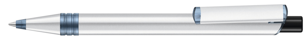 Metall-Druckkugelschreiber mit Metallspitze, Metallschaft und Metallclip aus recyceltem Aluminium, Kunststoffteile aus recyceltem PET-Material in klar transparent und gedeckt farbigem Drücker.