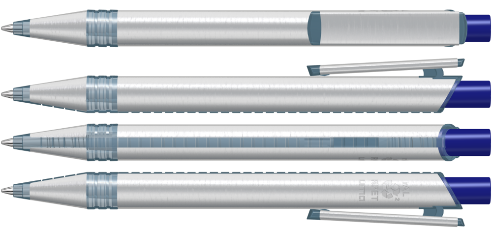 Metall-Druckkugelschreiber mit Metallspitze, Metallschaft und Metallclip aus recyceltem Aluminium, Kunststoffteile aus recyceltem PET-Material in klar transparent und gedeckt farbigem Drücker.
