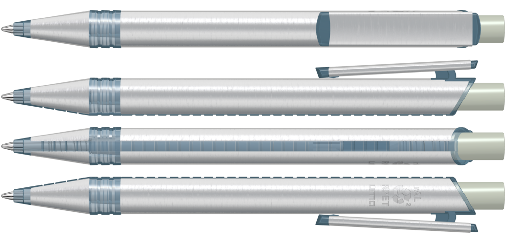 Metall-Druckkugelschreiber mit Metallspitze, Metallschaft und Metallclip aus recyceltem Aluminium, Kunststoffteile aus recyceltem PET-Material in klar transparent und gedeckt farbigem Drücker.