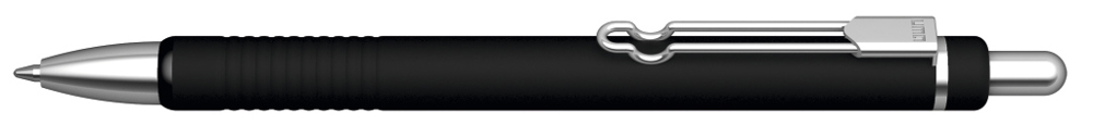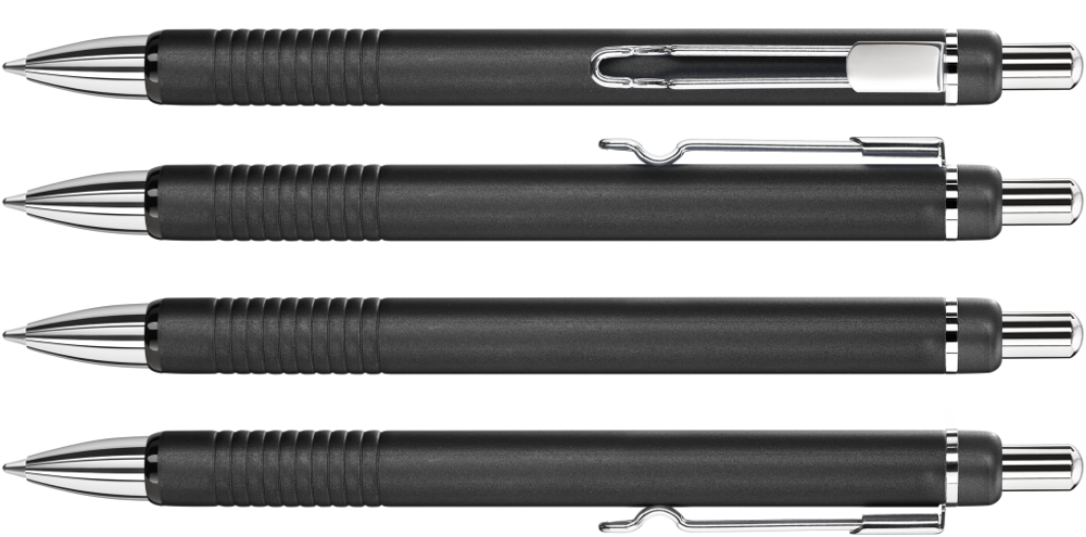 Metall-Druckkugelschreiber mit matt lackiertem Aluminiumschaft und integrierter Griffzone. Metallbügelclip und Beschläge glanzverchromt. Zierring schwarz.