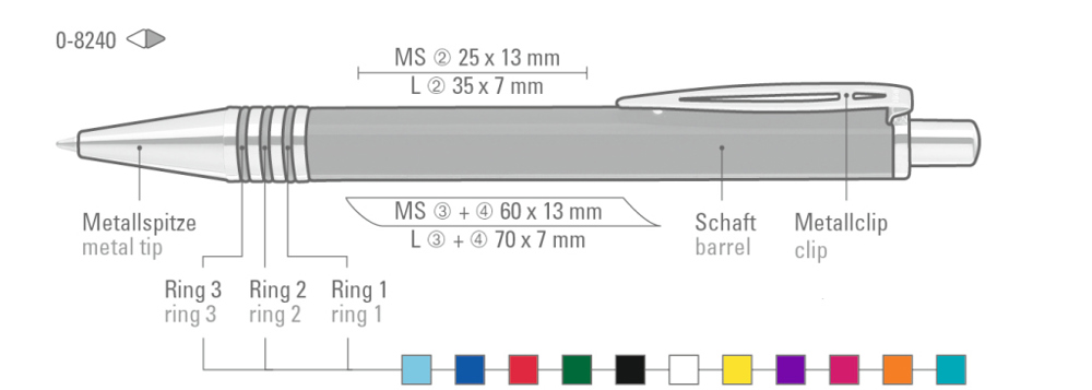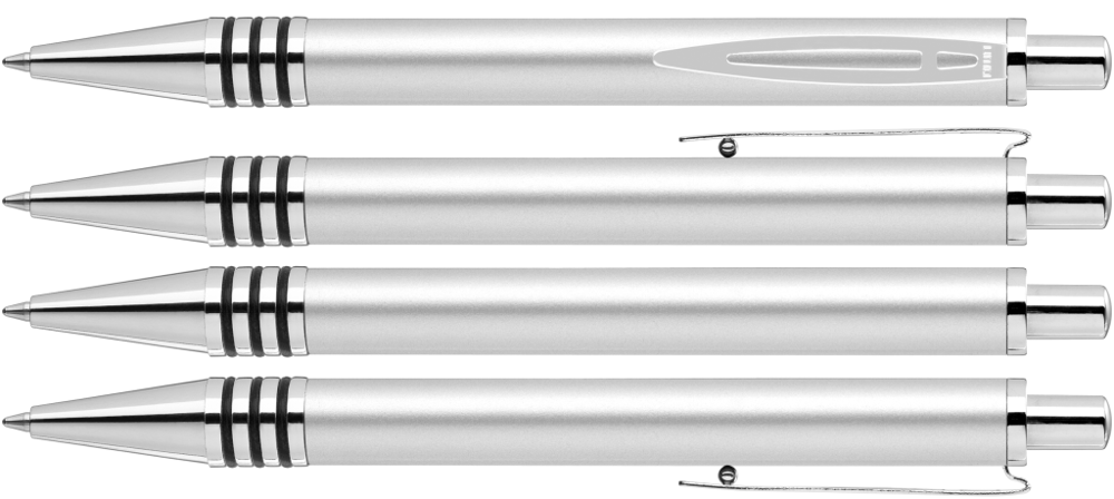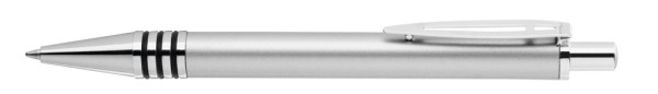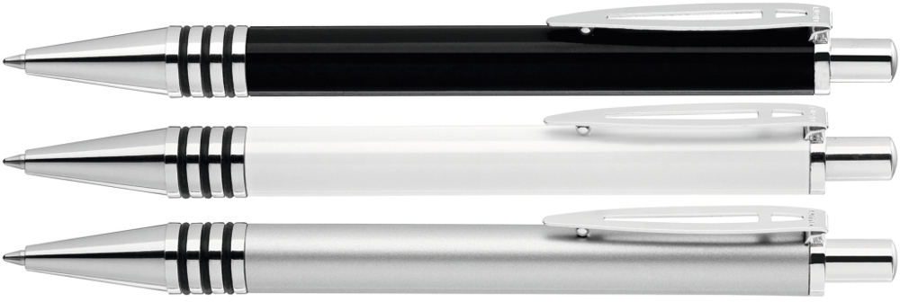 Metall-Druckkugelschreiber mit glänzend lackiertem Aluminiumschaft und 3 eingelassenen, kombinierbaren Gummiringen. Metallbeschlagteile glanzverchromt.