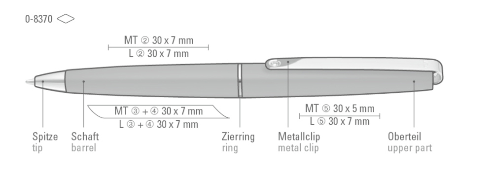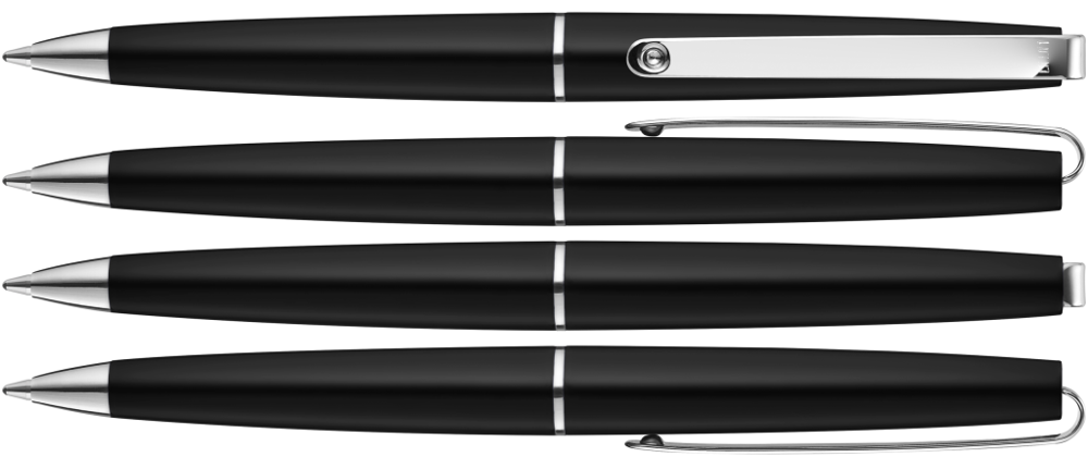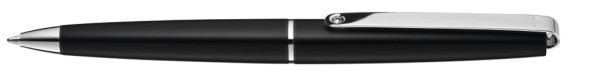 Metall-Drehkugelschreiber mit Softdrehmechanik und glänzendem Gehäuse. Langer flexibler Metallclip, Zierring und Spitze glanzverchromt.